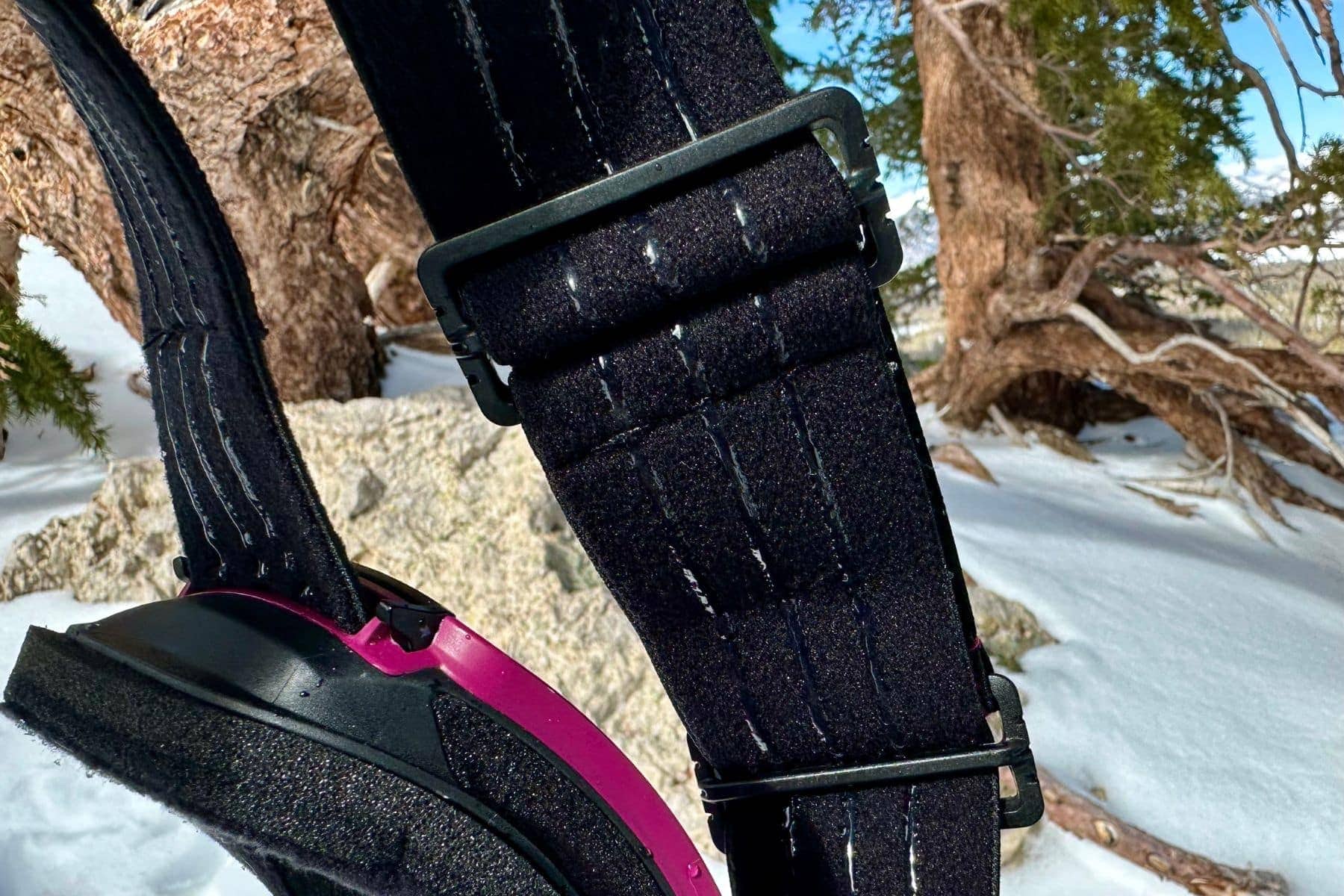 The Lightyear ski goggle strap is made of silicone. The silicone strap is fully waterproof, helping support its lifespan. Inside the strap are three silicone strips to provide a secure grip. Wearing the strap over or under your helmet is possible due to the double-adjustable buckles.